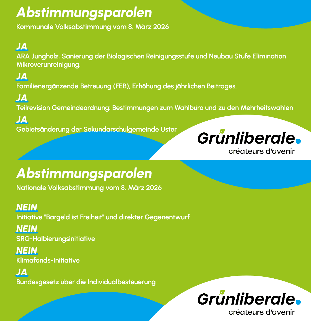 Hier findest Du unsere Parolen für die Stadt Uster sowie die nationalen Abstimmungen, über welche am 8. März 2026 stattfinden.